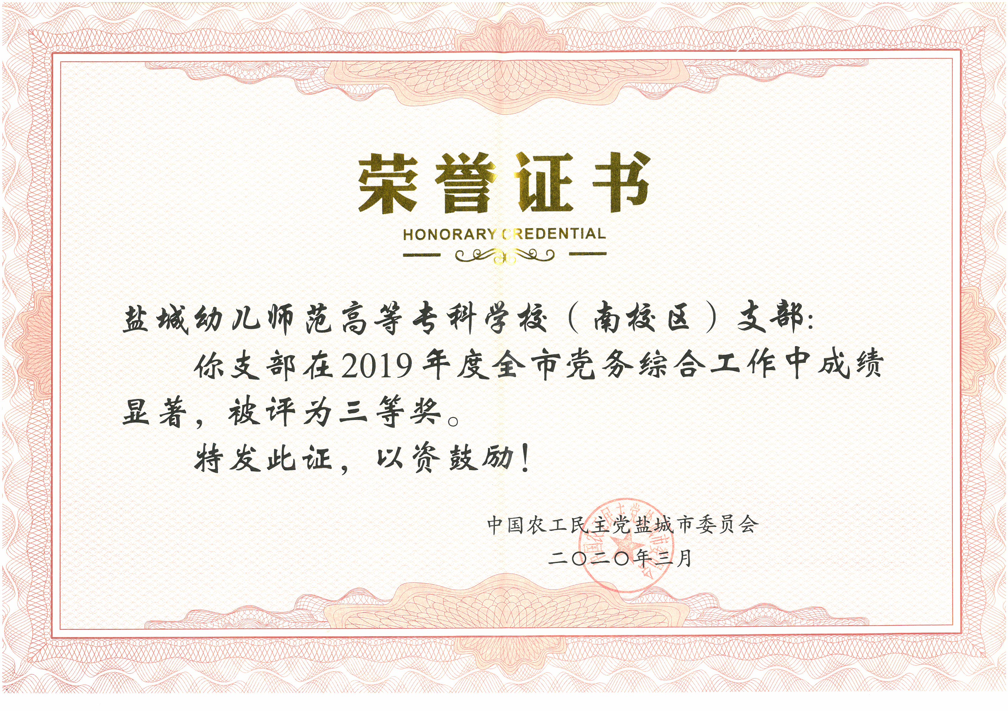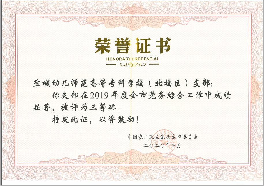 据农工党盐城市委员会《关于表彰农工党盐城市2019年度先进集体和先进个人的决定》(农盐发〔2020〕4号),农工党盐城幼专(南校区)支部、(北校区)支部在2019年度全市党务综合工作中成绩显著,均被评为三等奖。王志兰同志荣获农工党盐城市2019年度“社会宣传工作先进个人”荣誉称号。
