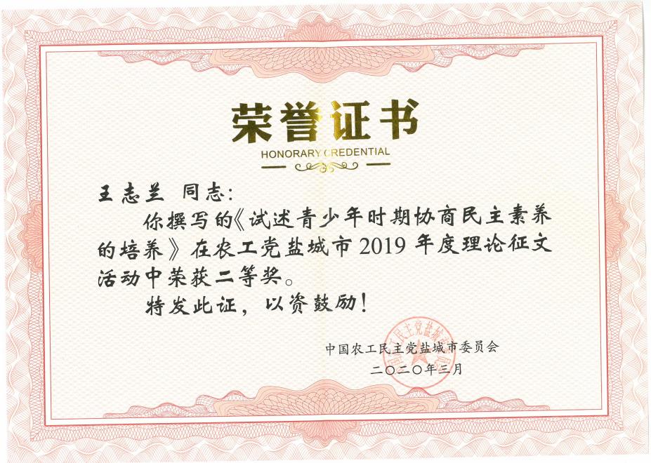 在农工党盐城市委组织的2019年度庆祝人民政协成立70周年理论研讨会论文征文比赛中,司国芹同志撰写的《勿忘此行 不忘初心》和王志兰同志撰写的《试述青少年时期协商民主素养的培养》均荣获二等奖。
