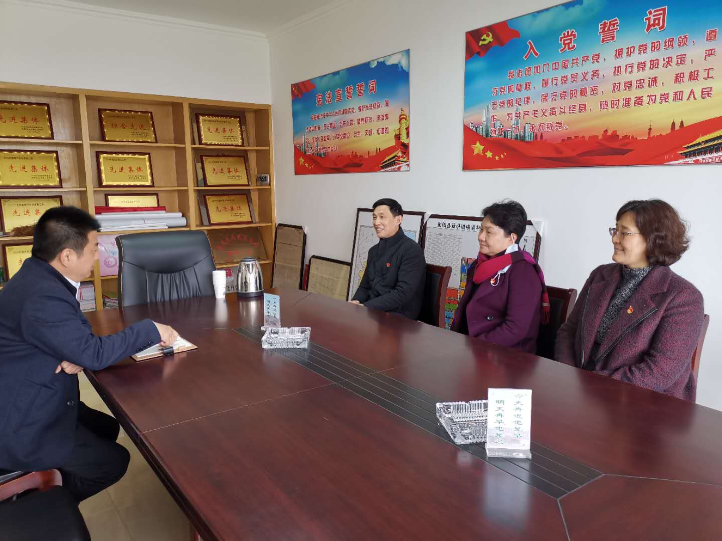 在横港村,刘毓航、崔霞、孙永龙与村书记王义彬深入交流,详细了解群众生产生活、贫困农户脱贫进展情况。王书记详细介绍了村集体近年来债务化解及经济发展等方面情况,高度肯定了我校长期以来对村里的帮扶工作并表示感谢。