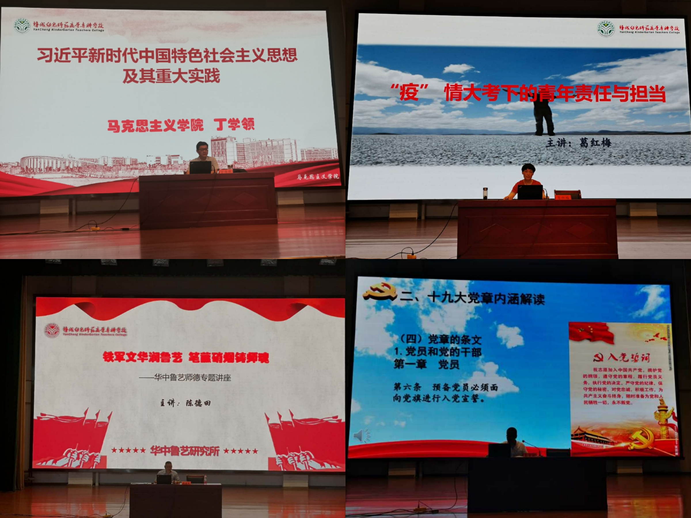 本次培训班以深入学习贯彻习近平新时代中国特色社会主义思想为主线,采取专家课堂辅导、现场教学、实践教学、身边的先进典型事迹宣讲等多种形式进行授课。培训班邀请了我校马克思主义学院党支部书记丁学领、党政办公室主任葛红梅、鲁迅艺术学院党总支宣传委员兼纪检委员、教师党支部书记陈德田以及机关第一党总支组织委员白美林四位专家,分别围绕《习近平新时代中国特色社会主义思想》《“疫”情大考下的青年责任与担当》《铁军文化润鲁艺 笔蘸硝烟铸师魂——华中鲁艺师德专题讲座》《党章及其发展历程教育》等主题开展专题辅导。
