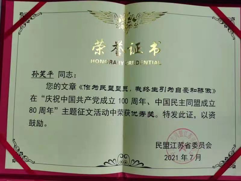 为庆祝中国共产党成立100周年、中国民主同盟成立80周年,民盟江苏省委在全省盟员中开展了“庆祝中国共产党成立100周年、中国民主同盟成立80周年”主题征文活动。我校民盟总支部积极发动,广大盟员踊跃参与,孔令玉、孙笑平两位老师作品获奖。