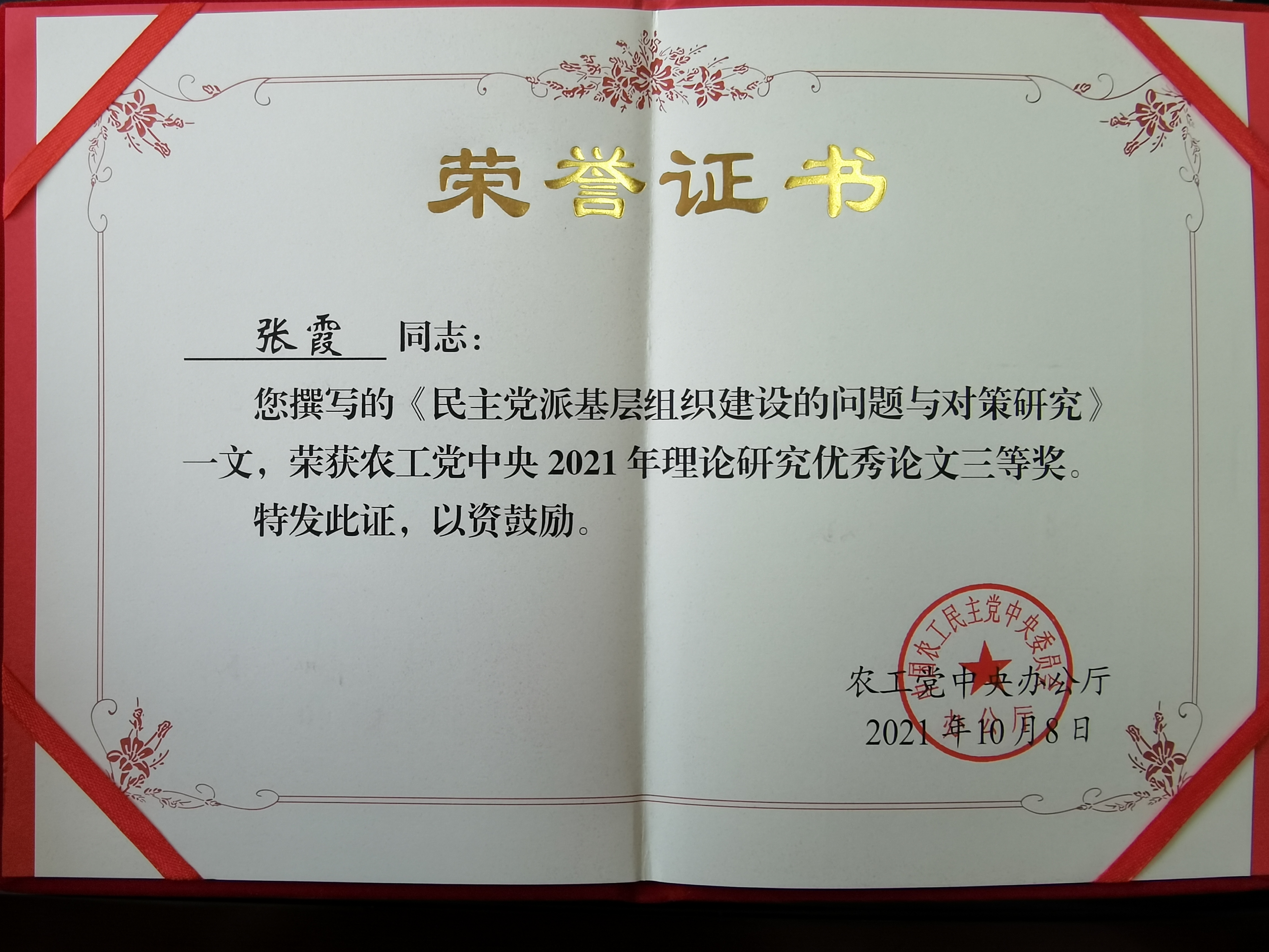 近日,农工党中央印发了《关于2021年理论研究优秀论文评审结果的通报》。我校农工党支部副主委张霞老师论文《民主党派基层组织建设的问题与对策研究》,在农工党中央组织的“庆祝中国共产党成立100周年理论研究征文”活动中,被评为农工党中央2021年理论研究优秀论文三等奖。