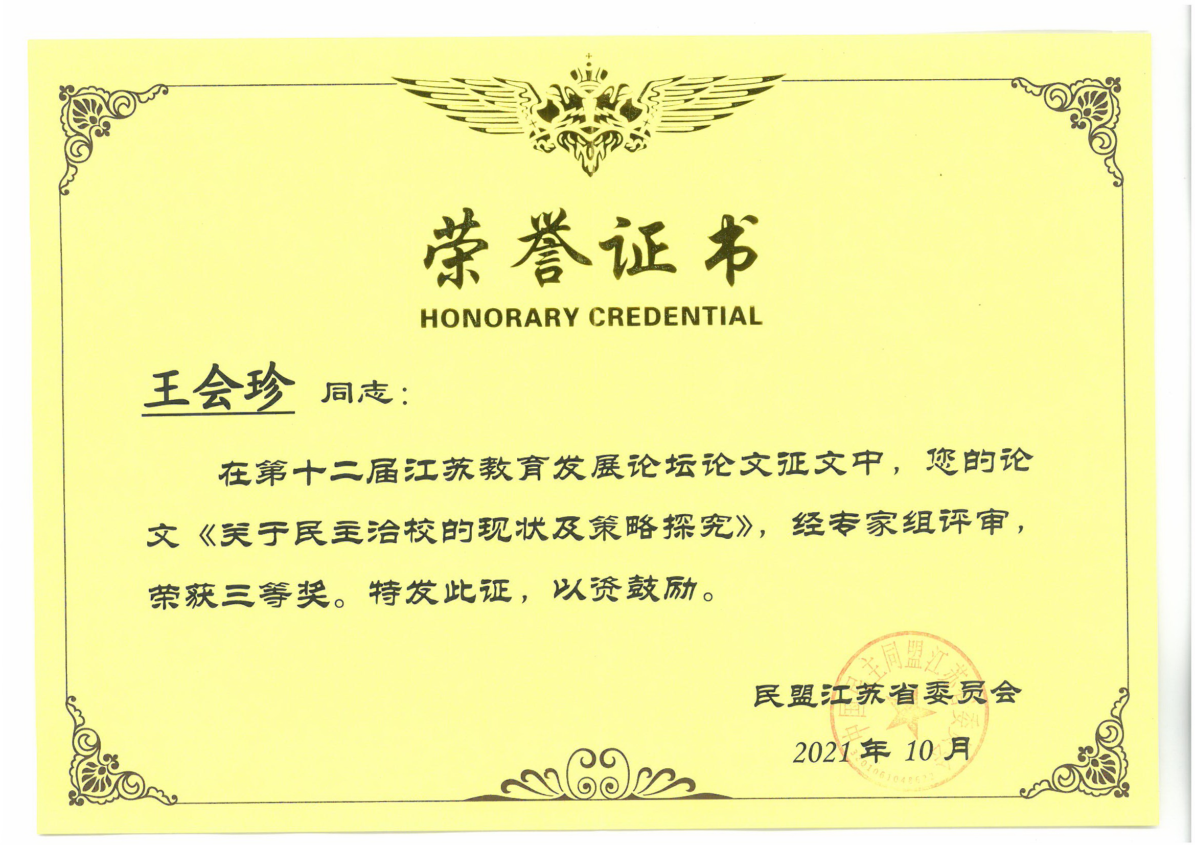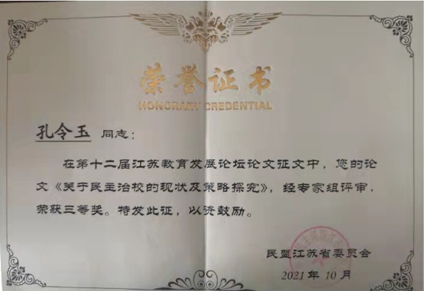 之前,论坛组委会就江苏教育发展问题进行了论文评比。我校民盟总支杨翠娟、王会珍的《多方协同合作,促进学前教育发展》荣获一等奖,孔令玉、王会珍的《关于民主治校的现状及策略探究》荣获三等奖。(民盟总支供稿)