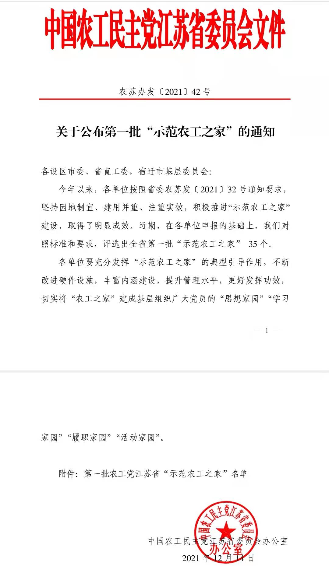 2021,我校农工支部积极推进示范农工之家建设申报江苏省“示范农工之家日前农工党江苏省委办公室评选结果我校农工之家被评为江苏省第一批“示范农工之家”。
