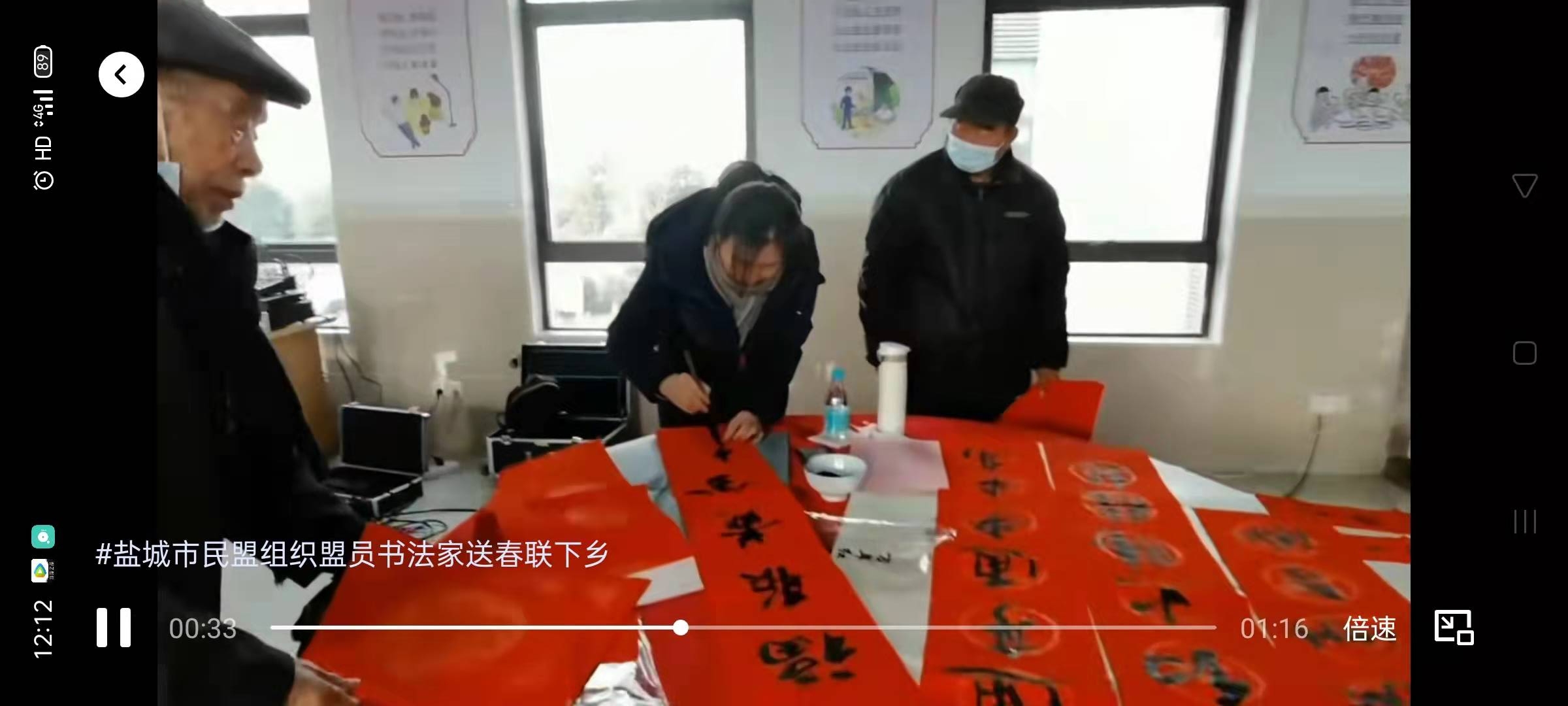 1月21日下午,民盟盐城幼专总支盟员李森梅参加了由民盟盐城市委联合建湖县新联会在建湖县西尖村开展的“送春联进万家”活动。