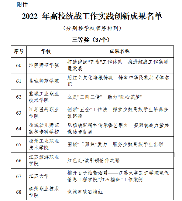 近日,江苏省委教育工委公布2022年高校统战工作实践创新成果名单,我校报送的《弘扬铁军精神传承鲁艺薪火 凝聚统战力量共谋幼专发展》荣获三等奖,这是我校首次获此荣誉。本次征集活动共遴选出全省高校76个优秀统战工作实践创新成果,其中一等奖10个,二等奖22个,三等奖37个,优秀奖7个。