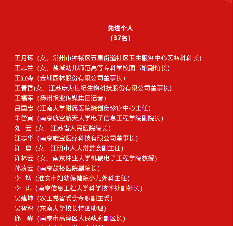 据悉,农工党中央此次在全国共表彰了543名先进个人和300个先进集体,其中江苏省共有37名党员和20个先进集体获得表彰。本次表彰,既是对王志兰同志个人工作成绩的充分肯定,更是对我校民主党派工作、统战工作的高度肯定。
