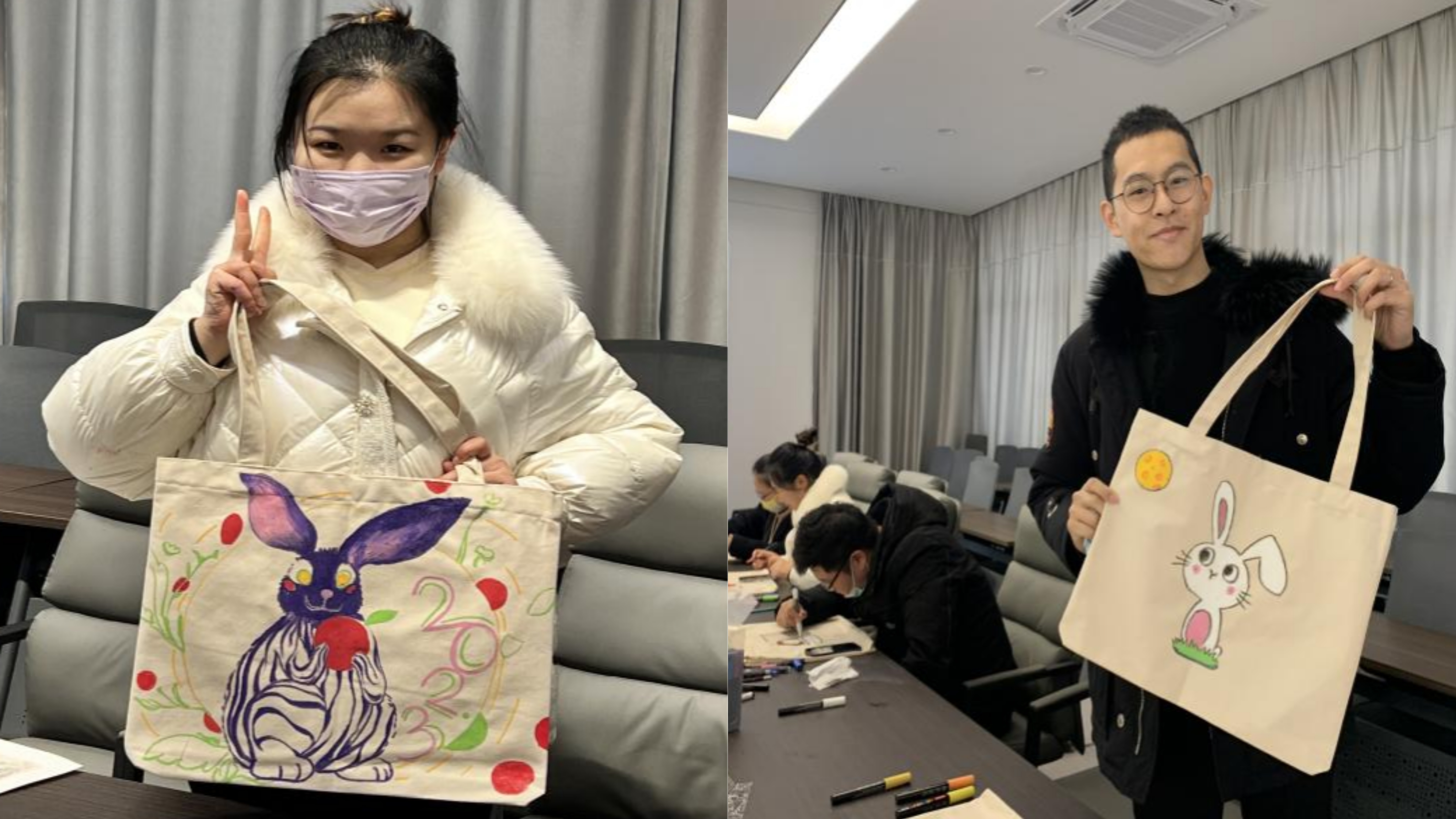 学习过后,会员们通过手绘兔子布包,写新春对联等方式喜迎卯兔新年。