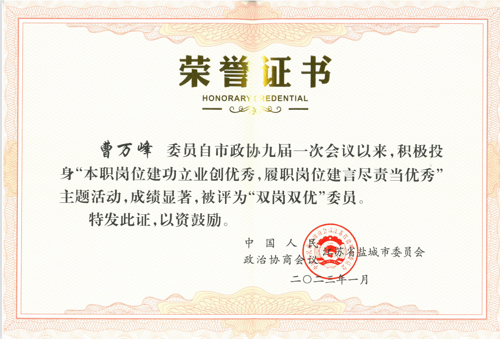 曹万峰委员积极投身“本职岗位建功立业创优秀,履职岗位建言尽责当优秀”主题活动,成绩显著,被评为“双岗双优委员”。