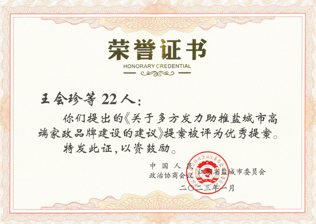 王会珍委员撰写的提案《关于多方发力助推盐城市高端家政品牌建设的建议》,得到了21名市政协委员附议,被评为“优秀提案”。