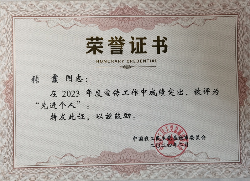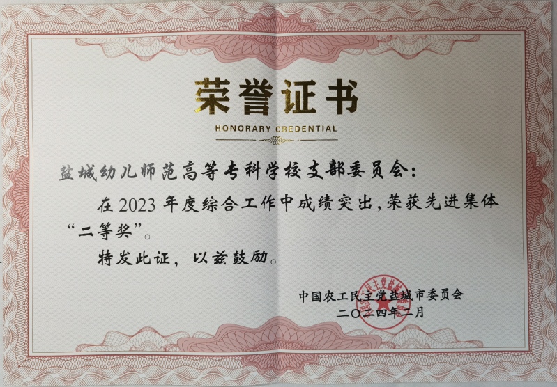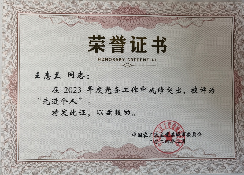 2月2日,农工党盐城市委会八届十次全体(扩大)会议召开。会议对2023年度综合工作先进集体和个人进行了表彰。我校农工党支部委员会获得“综合工作先进集体二等奖”表彰!支部主委王志兰获评“2023年度党务工作先进个人”,支部副主委张霞获评“2023年度宣传工作先进个人”。