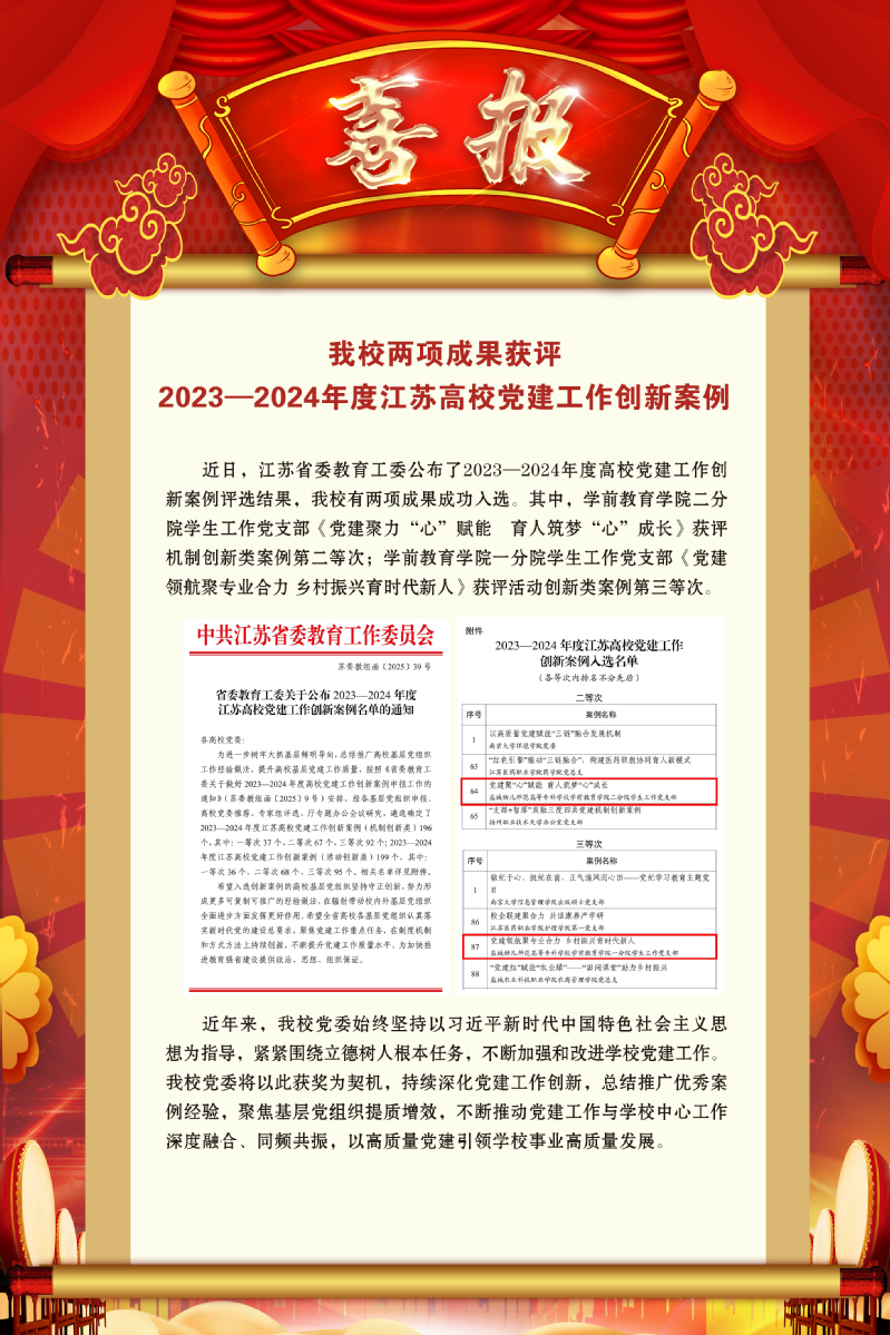 近日,江苏省委教育工委公布了2023—2024年度高校党建工作创新案例评选结果,我校有两项成果成功入选。其中,学前教育学院二分院学生工作党支部《党建聚力“心”赋能 育人筑梦“心”成长》获评机制创新类案例第二等次;学前教育学院一分院学生工作党支部《党建领航聚专业合力 乡村振兴育时代新人》获评活动创新类案例第三等次。
